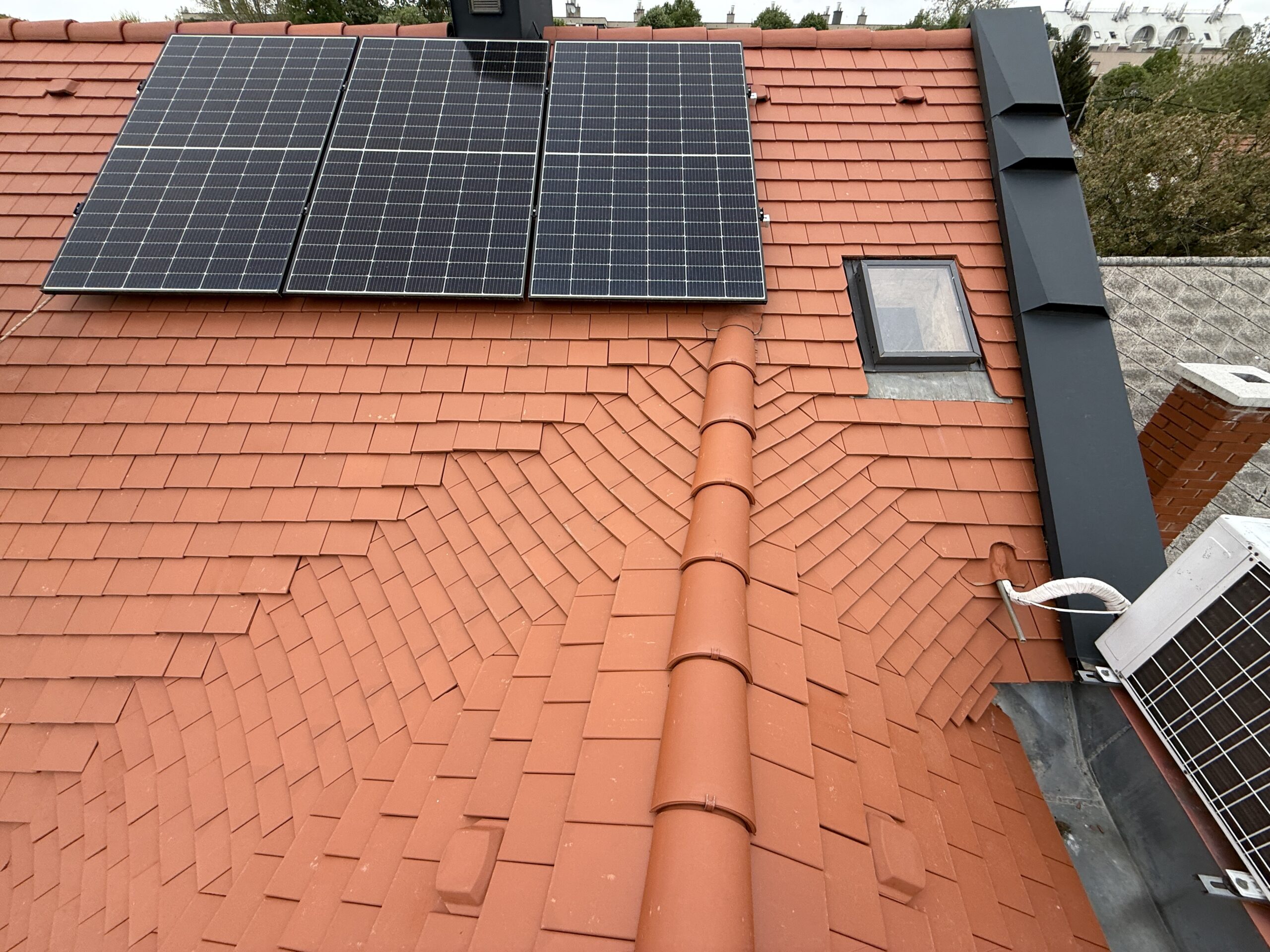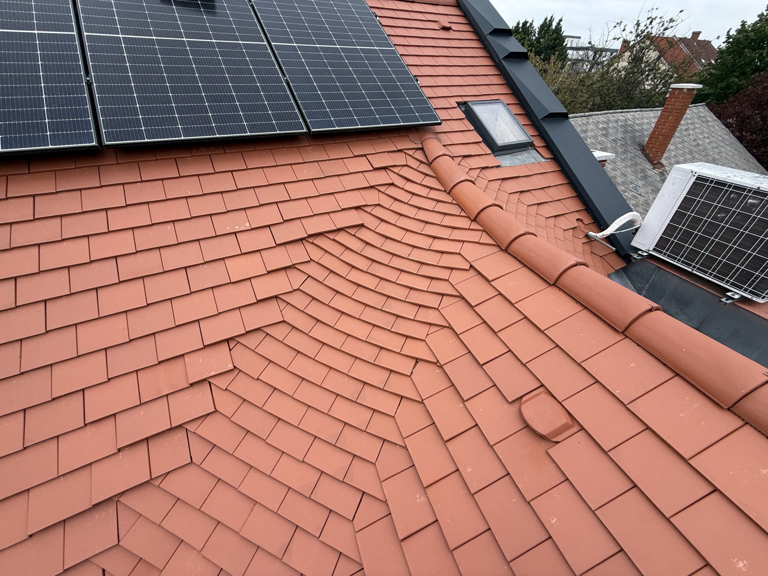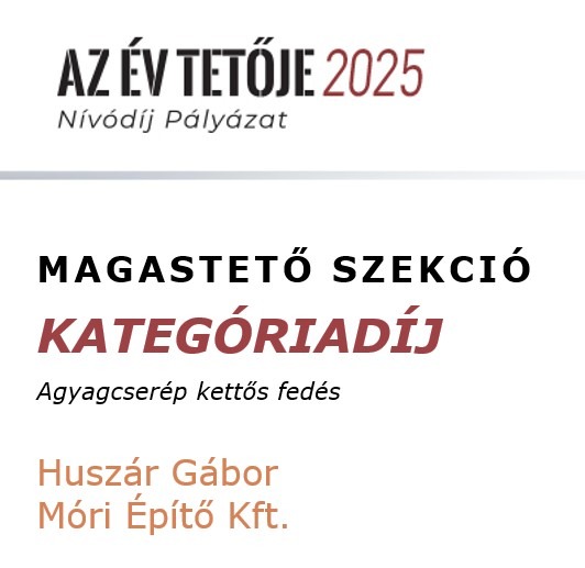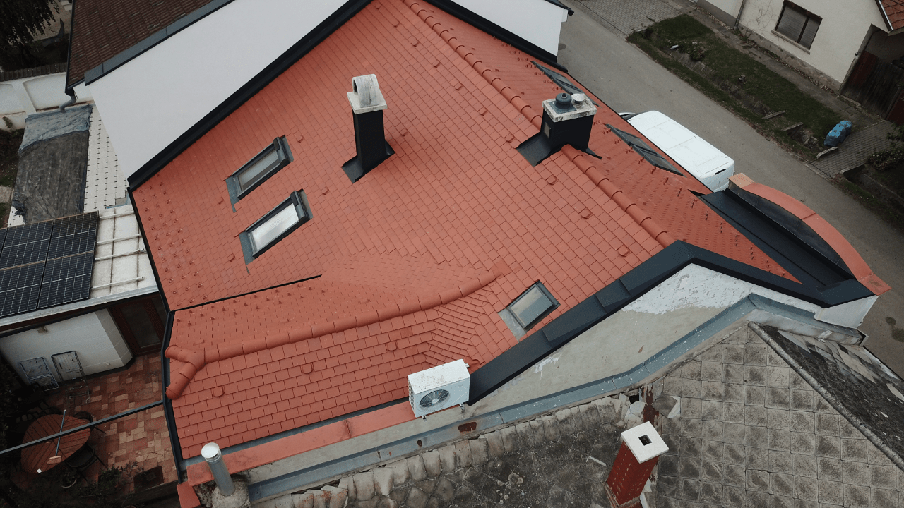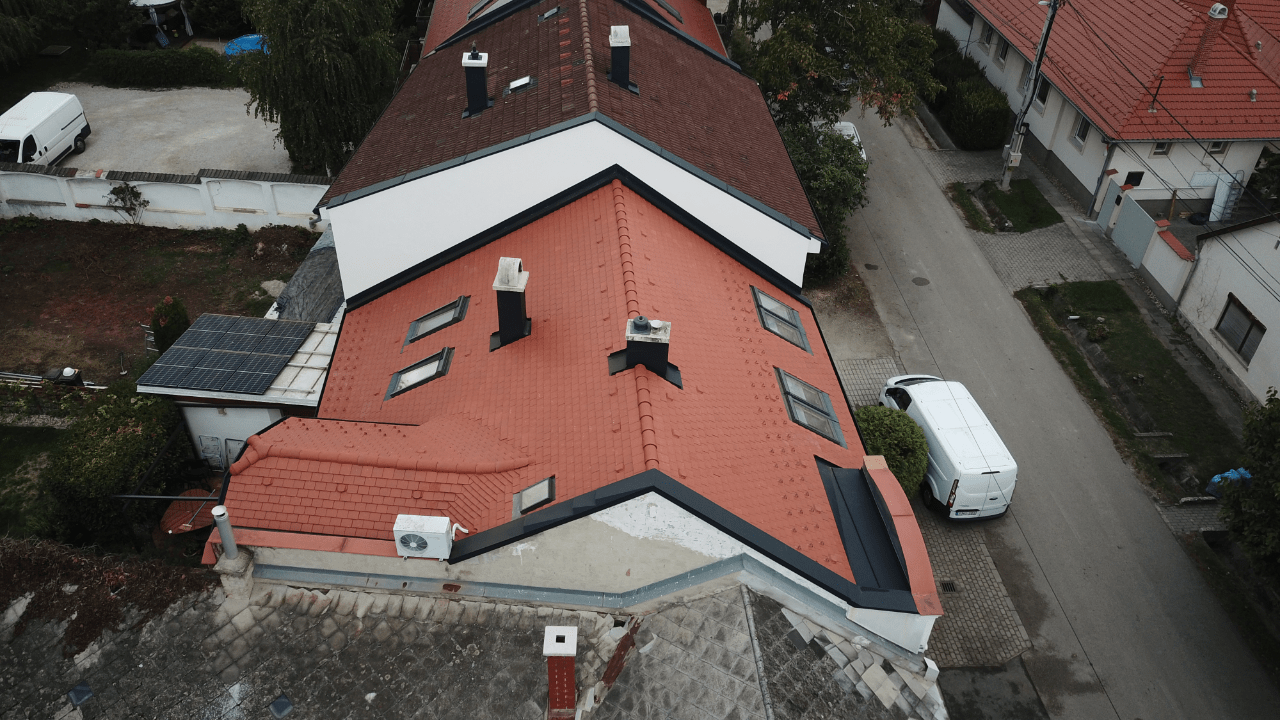 A meglévő tetőfedést a szarufák felső síkjáig visszabontották. A hőszigetelést kiegészítették, vastagságát megnövelték. Új alátéthéjazatot, növelt méretű ellenlécezést, valamint új bádogos szerkezeteket készítettek. A tetősíkok az ereszvonal irányába változó szélességűek, melyet rövidlemezes szegélyek használatával oldott meg a pályázó. Nehezítő körülmény volt, hogy a tetősíkban fekvő ablakokat az építtető nem engedte kibontani, ezért a meglévő szinten kellett megoldani a szél és vízzárást. Az ablakok körül mindent kibontva egy új megfelelő méretű vaktokot építettek be, amire feltámaszkodhatott a nyílászáró, és amihez az alátéthéjazattal jól átgondolt módon, szélzáróan csatlakoztak. A süllyesztett kivitel miatt az eredeti burkoló keret szinte minden elemét átszabták, vagy korcolták és a cserepezés közben is használtak vízzáró lemezeket az ablak alsó részén a cserép sorok közé rejtve, mivel nem fért el a dupla sor az ólom köpeny alatt. Az udvar felőli oldalon egy nagyobb méretű kutyaól csatlakozik a főtetőbe, melynek két hajlatát 3 cserép széles német hajlattal fedték ki. A rövidebb hajlat klasszikus módon készült, a hosszabb azonban komoly fejtörést okozott. Ennél a hajlatnál a megegyező hajlásszögön kívül minden változó volt, a léckiosztás eltérő és a sarok csatlakozás is hegyes szöget zár be. Huszár Gábor a sűrűbb kiosztású oldalon tartotta a hajlat tengellyel párhuzamos bekötésű pontokat; a másik oldalon a lábvonalak metszés pontjai távolodnak a hajlat tengelyétől, ezért néha dupla, vagy a hajlat végénél akár 3 alávezetett sort is alkalmazott, hogy a bekötési pontok újra közelebb kerüljenek a hajlat tengelyhez. A fedés TONDACH Táska szögletes natúr téglavörös tetőcseréppel készült.