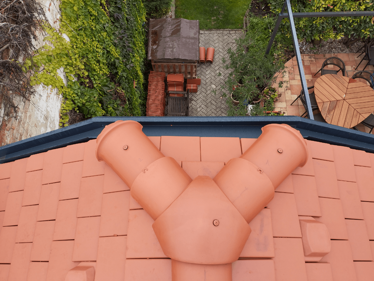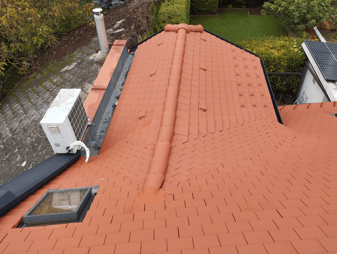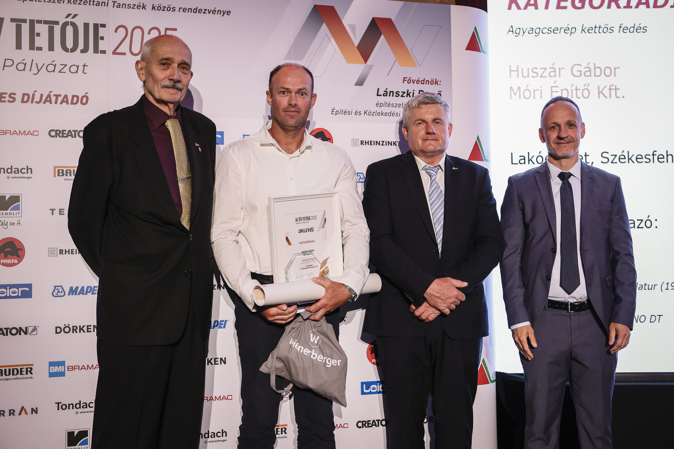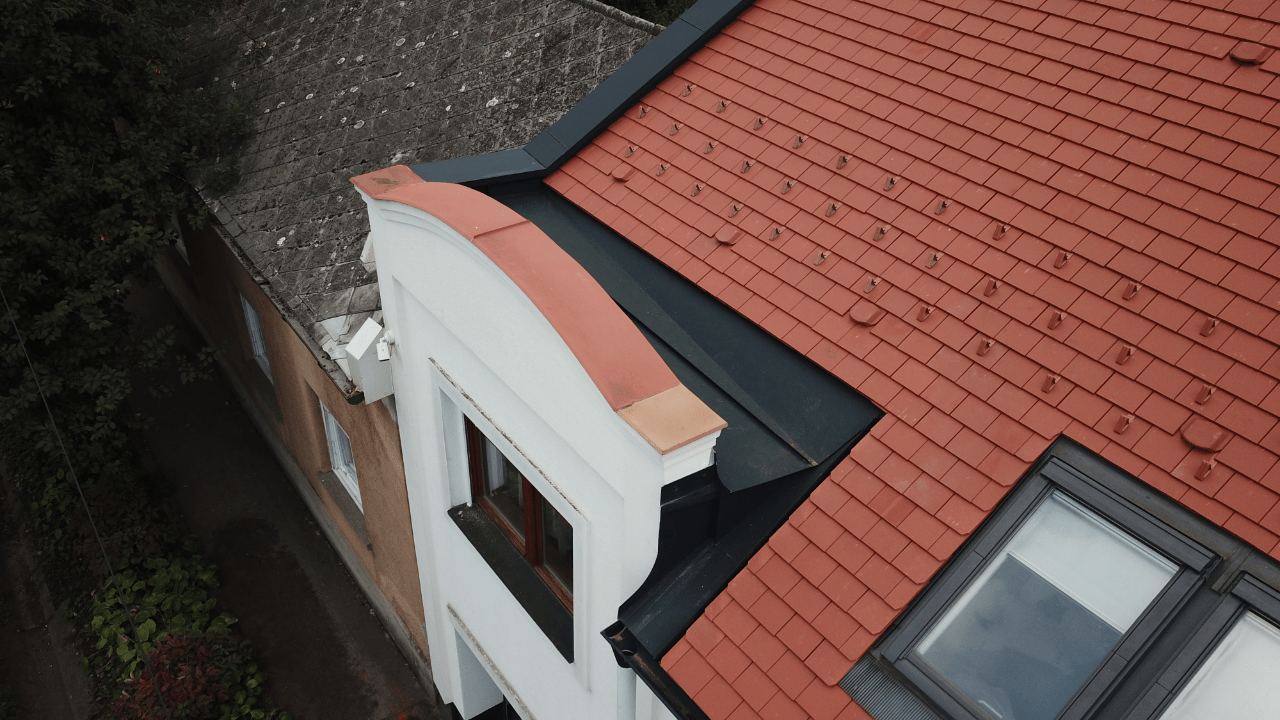 A meglévő tetőfedést a szarufák felső síkjáig visszabontották. A hőszigetelést kiegészítették, vastagságát megnövelték. Új alátéthéjazatot, növelt méretű ellenlécezést, valamint új bádogos szerkezeteket készítettek. A tetősíkok az ereszvonal irányába változó szélességűek, melyet rövidlemezes szegélyek használatával oldott meg a pályázó. Nehezítő körülmény volt, hogy a tetősíkban fekvő ablakokat az építtető nem engedte kibontani, ezért a meglévő szinten kellett megoldani a szél és vízzárást. Az ablakok körül mindent kibontva egy új megfelelő méretű vaktokot építettek be, amire feltámaszkodhatott a nyílászáró, és amihez az alátéthéjazattal jól átgondolt módon, szélzáróan csatlakoztak. A süllyesztett kivitel miatt az eredeti burkoló keret szinte minden elemét átszabták, vagy korcolták és a cserepezés közben is használtak vízzáró lemezeket az ablak alsó részén a cserép sorok közé rejtve, mivel nem fért el a dupla sor az ólom köpeny alatt. Az udvar felőli oldalon egy nagyobb méretű kutyaól csatlakozik a főtetőbe, melynek két hajlatát 3 cserép széles német hajlattal fedték ki. A rövidebb hajlat klasszikus módon készült, a hosszabb azonban komoly fejtörést okozott. Ennél a hajlatnál a megegyező hajlásszögön kívül minden változó volt, a léckiosztás eltérő és a sarok csatlakozás is hegyes szöget zár be. Huszár Gábor a sűrűbb kiosztású oldalon tartotta a hajlat tengellyel párhuzamos bekötésű pontokat; a másik oldalon a lábvonalak metszés pontjai távolodnak a hajlat tengelyétől, ezért néha dupla, vagy a hajlat végénél akár 3 alávezetett sort is alkalmazott, hogy a bekötési pontok újra közelebb kerüljenek a hajlat tengelyhez. A fedés TONDACH Táska szögletes natúr téglavörös tetőcseréppel készült.